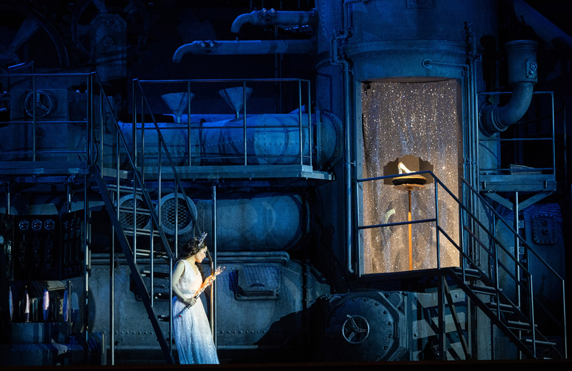 Mariame Clément aborde l’œuvre avec finesse. Machine à produire des princesses, crinolines rose bonbon, salle de bal grandiose mais aussi liquette et baskets : la metteuse en scène joue avec les clichés et la Belle Époque – celle de la création de la partition –, lançant des clins d’œil à la Fée électricité et au cinéma de Méliès. Une façon de mieux réfléchir au mythe et aux conventions sociales… tout en gardant son âme d’enfant.