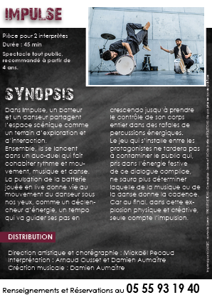 Dans un crescendo d’énergie et de créativité, Impulse invite le public à vivre une expérience im­mersive où la danse et la musique s’entrelacent pour ne former qu’un. Ce duo complice, mêlant virtuosité et expressivité, propose une exploration dynamique des émotions et de l’énergie brute.