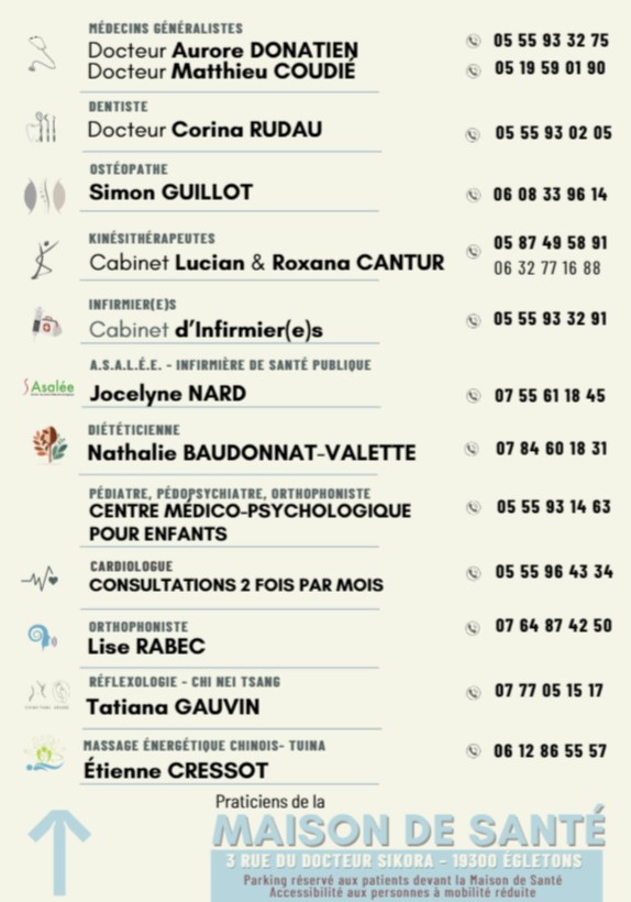 Professionnels, Santé, Cabinets infirmiers, Cardiologues, Dentistes, Infirmiers, Kinésithérapeutes, Ostéopathes, Pédiatres, Relaxologues